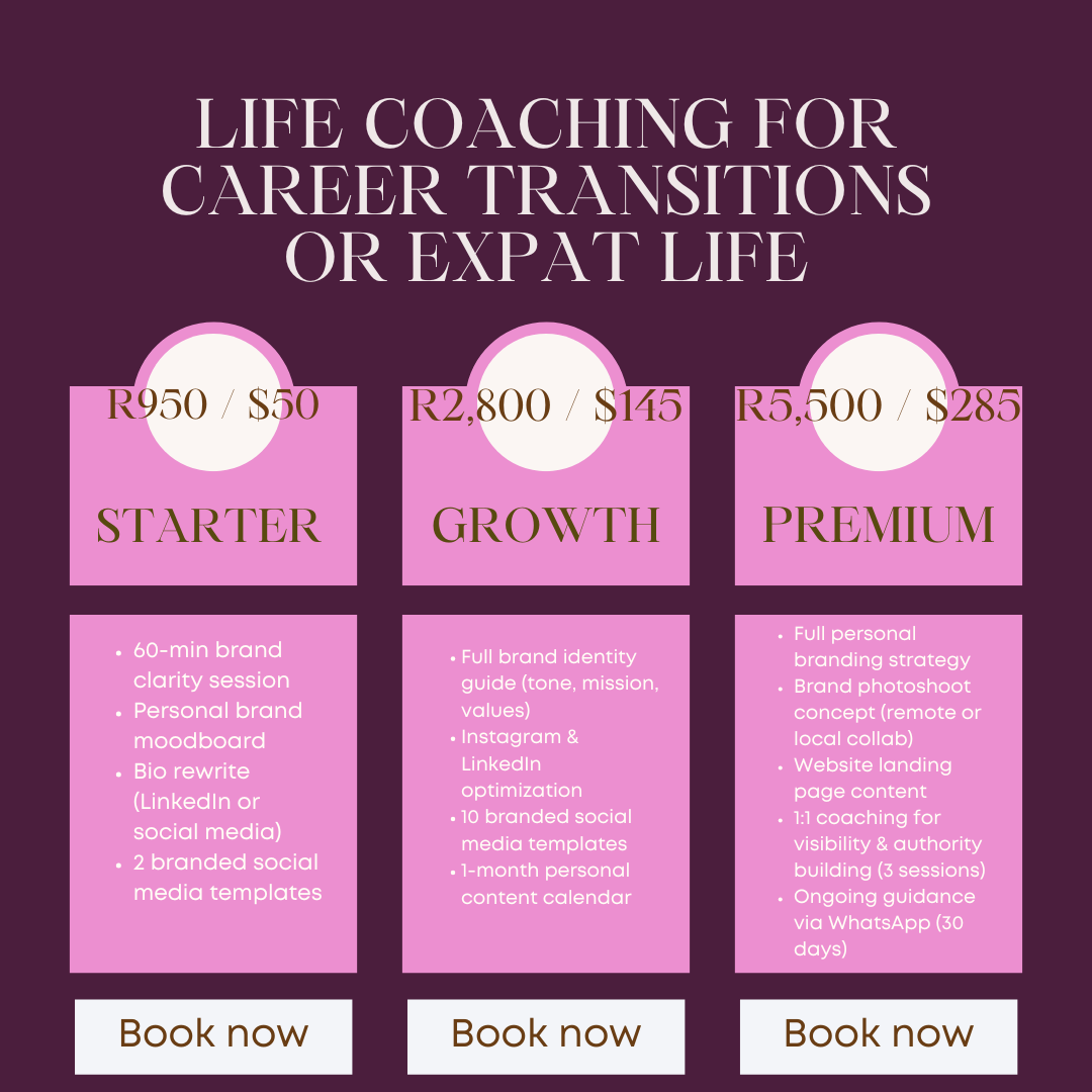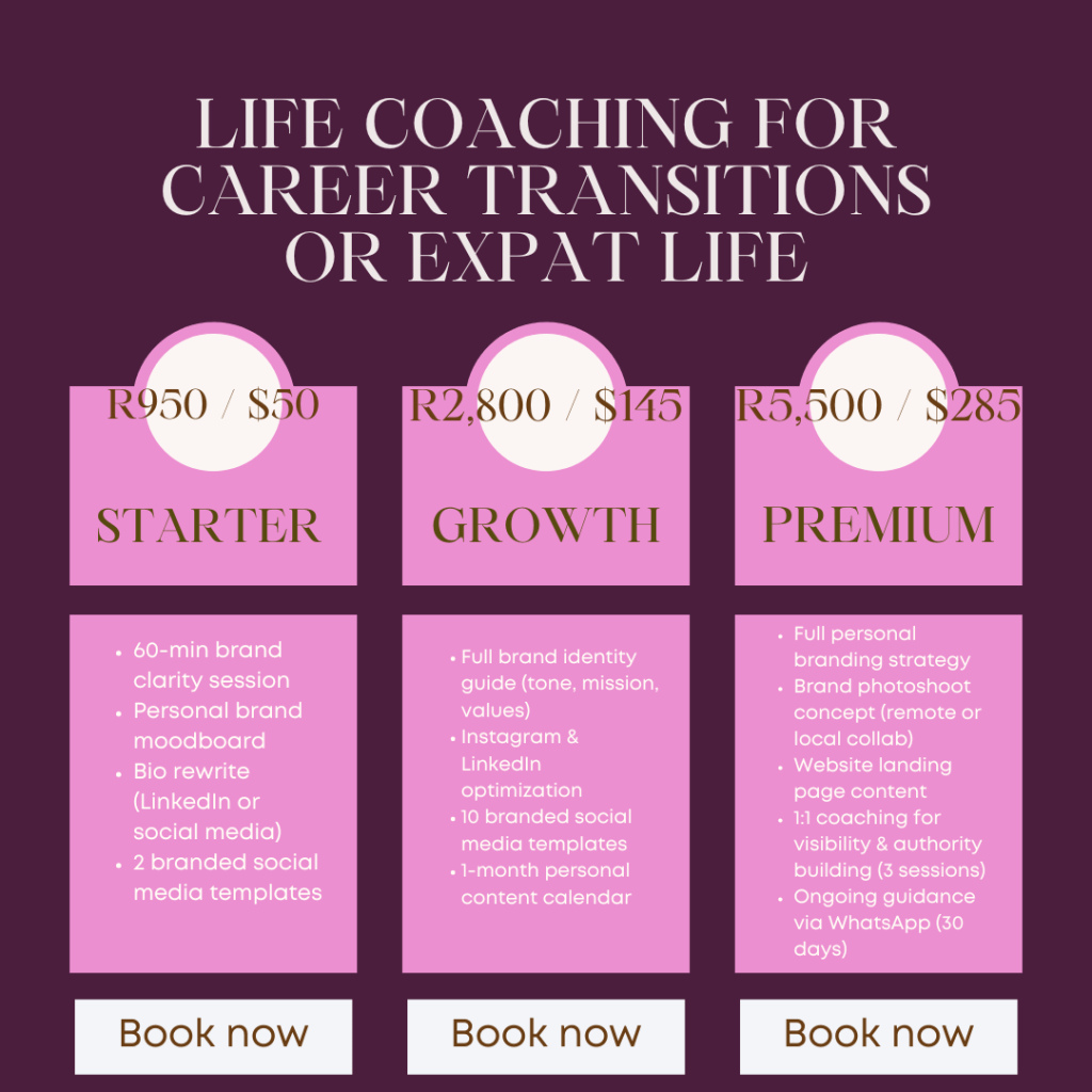 Life Coaching for Career Transitions or Expat Life ✨ Optional Add-ons (for all packages) ✍️ Copywriting: R500 / $30 per page 📸 Canva Templates: R400 / $22 for 10 🌍 Website Audit: R950 / $50 📅 Weekly Accountability Check-ins: R1,200 / $65 per month Contact us Share this: Share on X (Opens in new window) X Share on Facebook (Opens in new window) Facebook Like Loading...